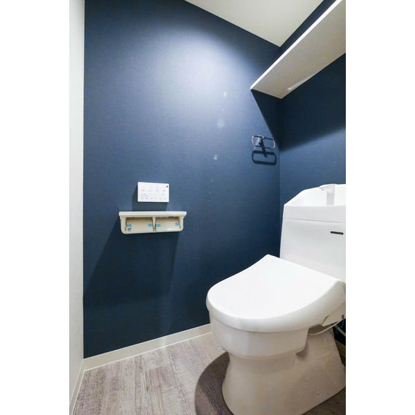 外壁面にアッパーライトを設置、建物全体の照度をアップ。グレー調の外壁タイルを照らすことでエレガントな見た目と防犯面にも効果を発揮。リビングとトイレの一面にアクセントクロスを施工します。